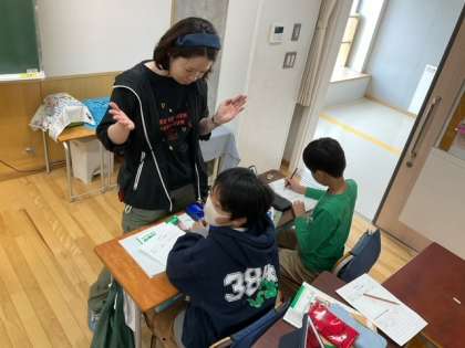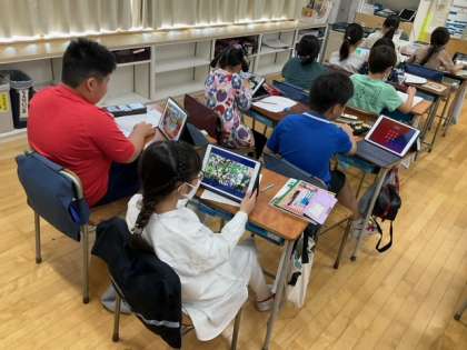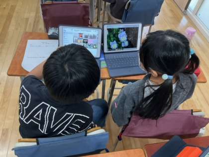 理科の時間です。「あたたかくなって」植物の観察の続きをしています。iPadで植物の写真を撮って、細かいところまで、しっかり観察しています。