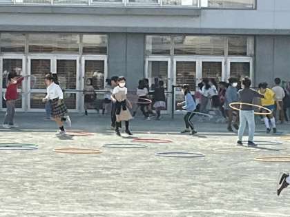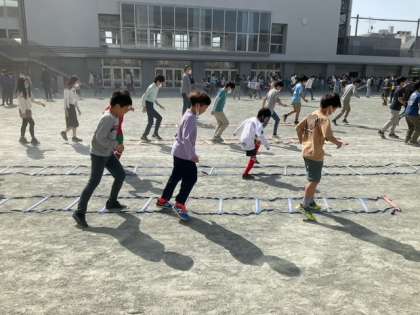 校庭をいっぱいに使って、「下北沢サーキット」にチャレンジしています。ラダーステップやフラフープ、登り棒など、さまざまな動きに取り組みます。