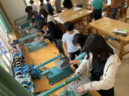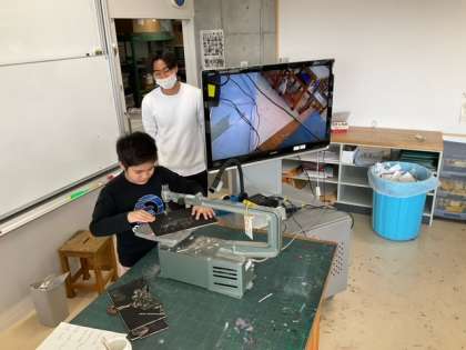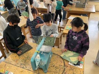 図工の時間です。電動糸のこぎりを使って、曲線を上手に切っています。上手くなったね!