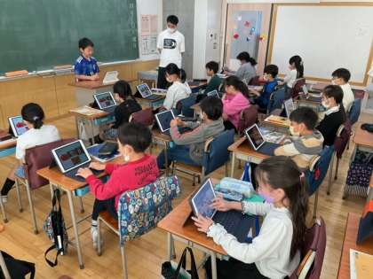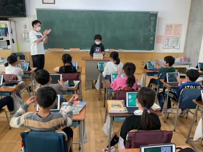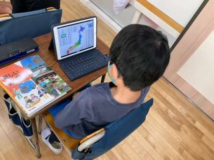 社会科の時間です。「都道府県調べ」をしました。今日は発表会をしています。iPadを活用して、わかりやすくプレゼンができましたね。