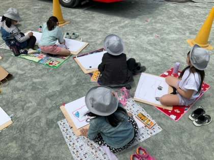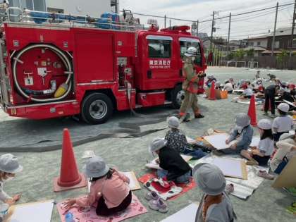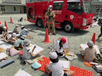 本物の消防自動車が下北沢小学校の校庭にやってきました。目を輝かせながら、消防自動車を描いています。