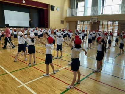 初めての5時間目、体育の時間です。運動会での学年演技の練習をしています。がんばれ!