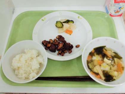 献立 ご飯、かつおと大豆のみそがらめ、かぶときゅうりの甘酢漬け、若竹汁、牛乳