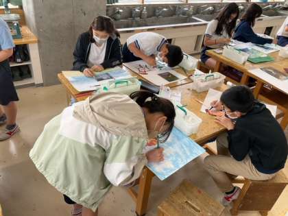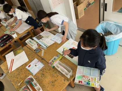 図工の時間です。「絵の一部から 想像を広げて」作者のタッチや筆づかいを取り入れて、作品を完成させます。