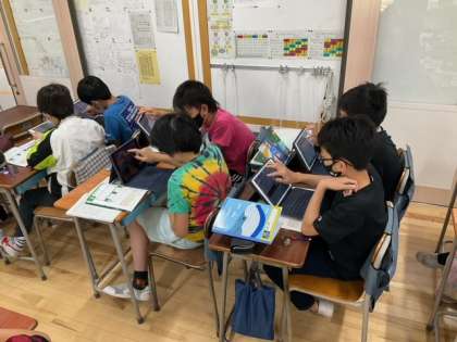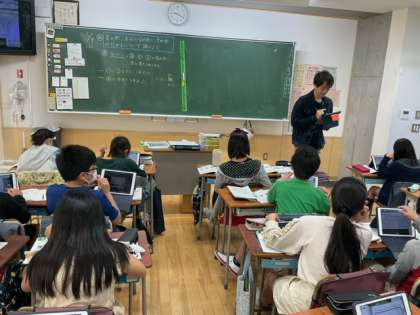算数の時間です。「対称な図形」星やホームベース、T の形の仲間を調べています。