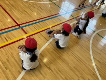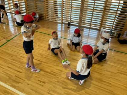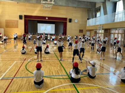 体育の時間です。「ダンスホール」の練習をしています。グループで教え合いながら、自分たちで工夫を加えて進めています。