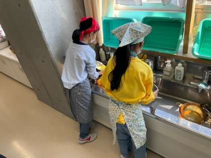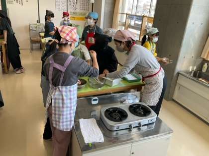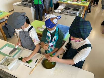家庭科の時間です。「ほうれん草のおひたし」を作っています。上手に盛り付けられるかな?