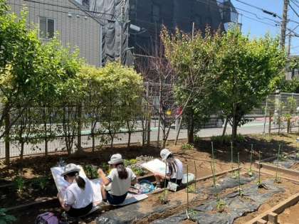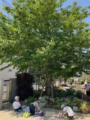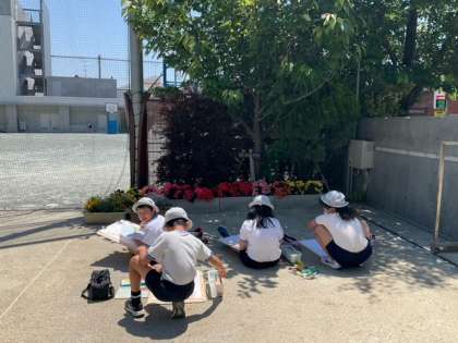 図工の時間です。「木を描こう」学校を歩いて、お気に入りの木を見つけて、スケッチしています。天気も良くて、気持ちがいいですね。