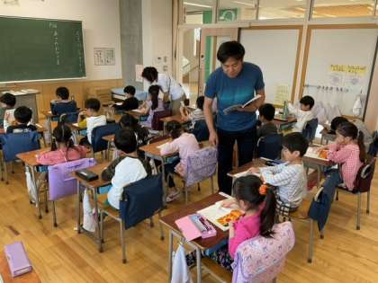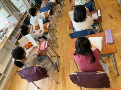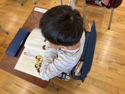 国語の時間です。「あさの おひさま」一つ一つの言葉を大切にしながら、声に出してていねいに文章を読んでいます。