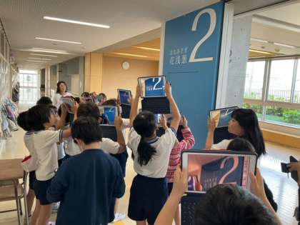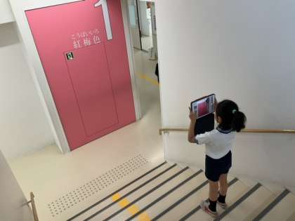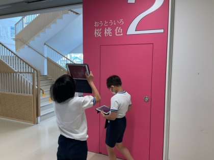日本語の時間です。校舎の階段の写真を撮っています。下北沢小学校の階段には、日本の伝統色の名前がついています。