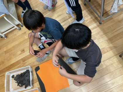 学級活動の時間です。運動会のスローガンが決まりました。掲示物は、各クラス一文字ずつ担当しています。スローガンの掲示は、体育館の窓に行います。