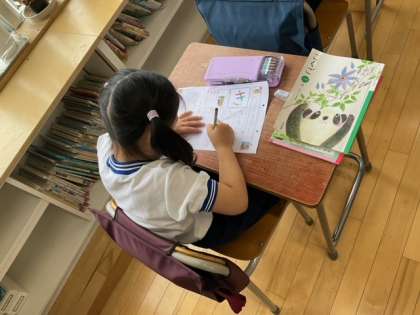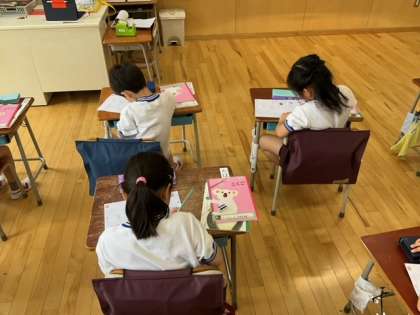 国語の時間です。ひらがなの学習が進んでいます。4つの部屋を意識して、形よく書けるようにしたいですね。