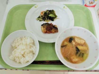 献立 ご飯、さばのねぎソースかけ、もやしとわかめの和え物、新じゃがと新玉ねぎのみそ汁、牛乳