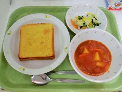 献立 フレンチトースト、トマトシチュー、小松菜とコーンのサラダ、牛乳