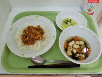 献立 根菜タコライス、シークワーサーサラダ、もずくと豆腐のスープ、牛乳
