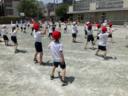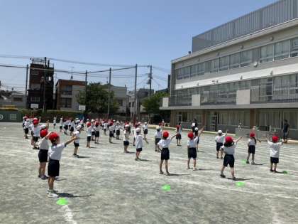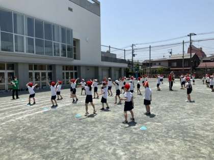 体育の時間です。校庭で元気いっぱいに踊っています。すごくかわいらしいですよ