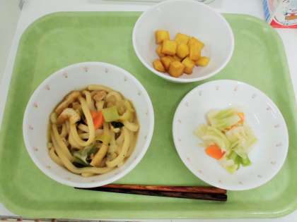 献立 煮込みうどん、塩だれキャベツのサラダ、キャラメルポテト、牛乳