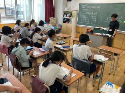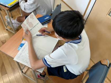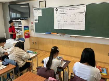 算数の時間です。いろいろな図形について、線対称か点対称か根拠も含めて考えています。