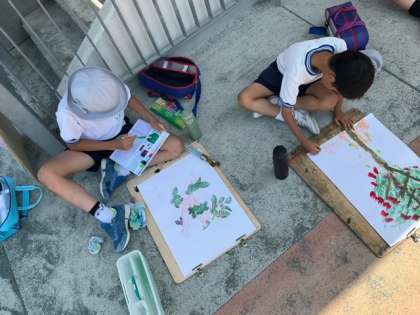 図工の時間です。「木を描こう」仕上げの段階に入っています。思ったような色づかいができましたか?