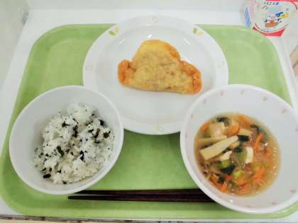 献立 わかめご飯、ジャンボぎょうざ、春雨スープ、牛乳