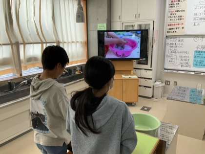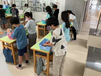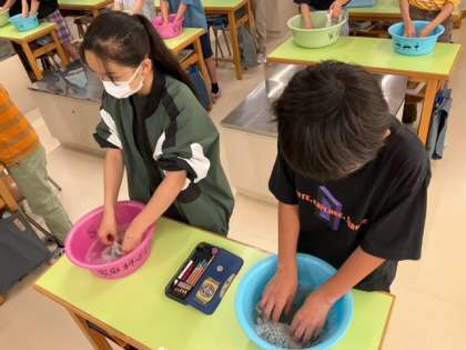 家庭科の時間です。「手洗いで洗濯をしよう」もみ洗い、つまみ洗い、おし洗いに挑戦しています。