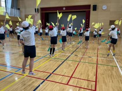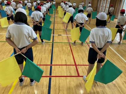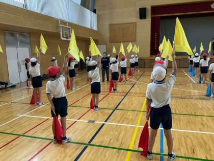 体育の時間です。「開幕スクラム宣言」フラッグが色鮮やかに、5年生の心を一つにしていきます。
