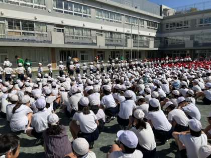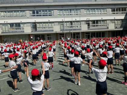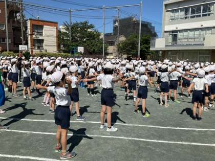 プログラム1番。全校児童による準備運動「ラジオ体操第一」です。