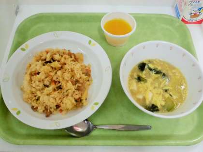 献立 キムチチャーハン、卵とコーンの中華スープ、みかんゼリー、牛乳