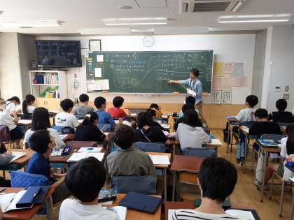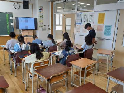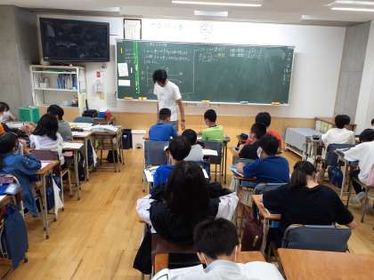 算数の時間です。分数のかけ算の学習をしました。数直線を使って分数をかけることの意味を考えました。