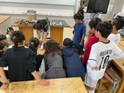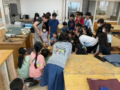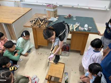 図工の時間です。今日は、のこぎりを使います。はじめに、安全なのこぎりの使い方をしっかりと学習しています。