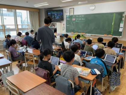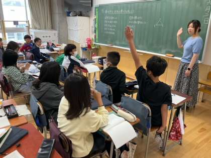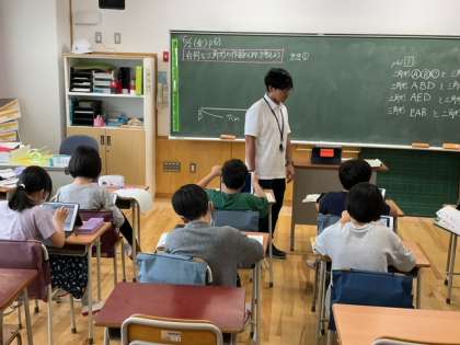 算数の時間です。合同な三角形のかき方を考えています。友達の考え方も参考にしています。