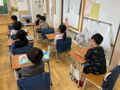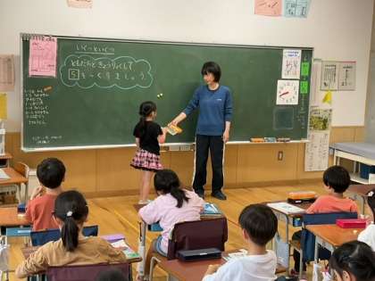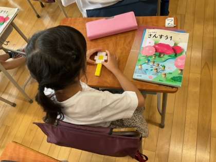 算数の時間です。「いくつといくつ」ブロックを作って、友達と協力して5を作ります。
