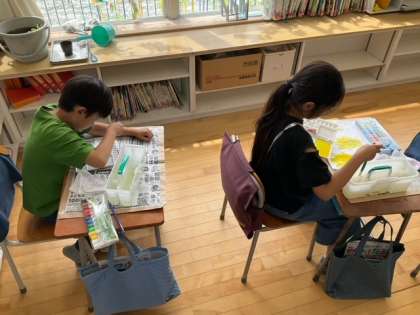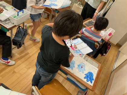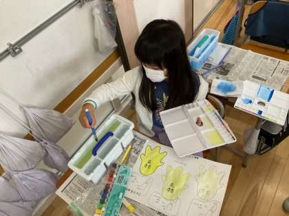 図工の時間です。絵の具を使って、こいいろおばけ、まんなかおばけ、うすいろおばけを塗り分けています。
