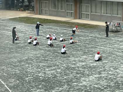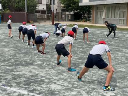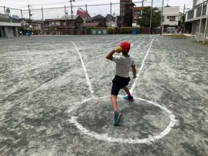 体育の時間です。準備運動をしっかり行ったあと、ソフトボール投げに挑戦しています。