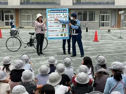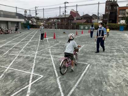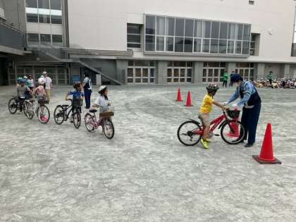 自転車安全教室を開催しています。警察署の方を講師にお招きして、安全な自転車の乗り方について学習しています。