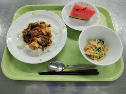 献立 豆腐となすの麻婆丼、かみかみサラダ、小玉すいか、牛乳