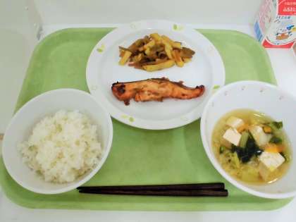 献立 ご飯、鮭のねぎみそ焼き、じゃが芋のきんぴら、豆腐汁、牛乳