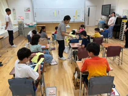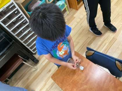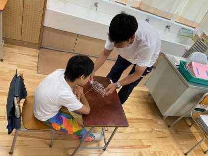図工の時間です。ペットボトルランプを作ります。これからペットボトルに巻く布を5本とります。