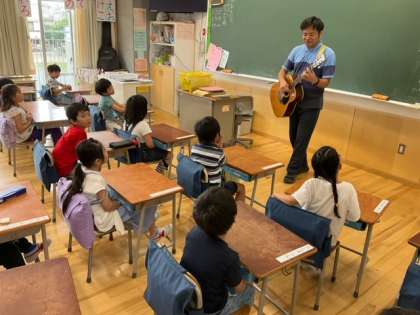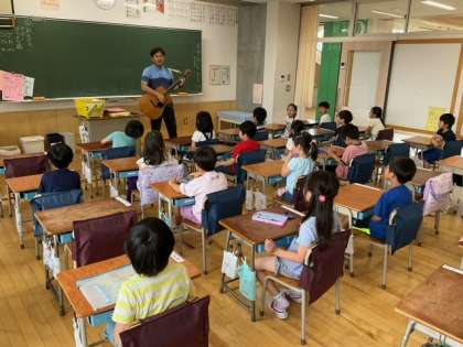 先生のギター伴奏で、今日の歌「にじ」を歌っています。さわやかな朝ですね。