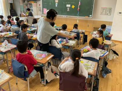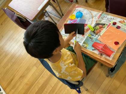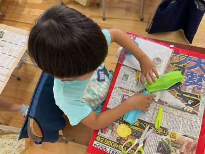 図工の時間です。「ちょっきんぱで かざろう」折り紙にハサミで切れ込みを入れて、ひねってくっつけると、きれいな形が出来ました。