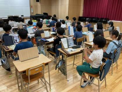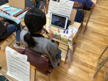 音楽の時間です。リコーダーの演奏をiPadで撮影しています。もっとも上手く演奏できたものを提出します。