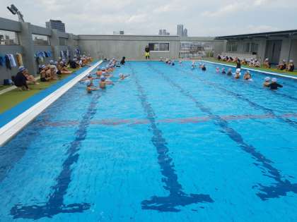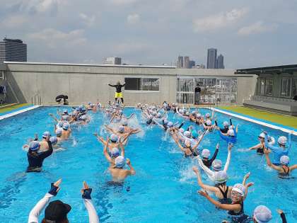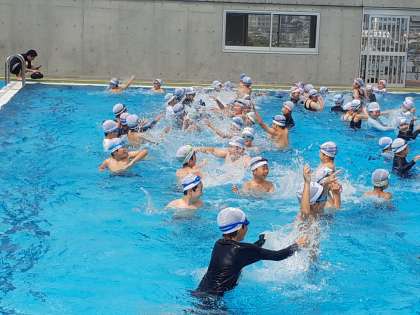 水泳の時間です。水を掛け合ったり、潜ったり、泳いだり、運動会のダンスホールを踊ったりと楽しそうでした。