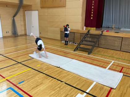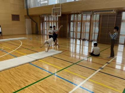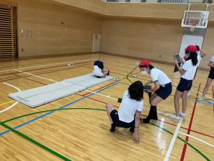 体育の時間です。「マット運動」の1時間目です。互いの技をiPadで撮影しながら、技の出来栄えを確認しています。