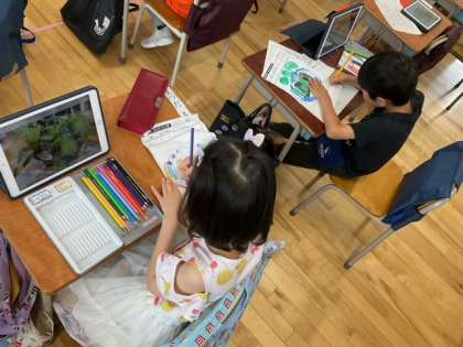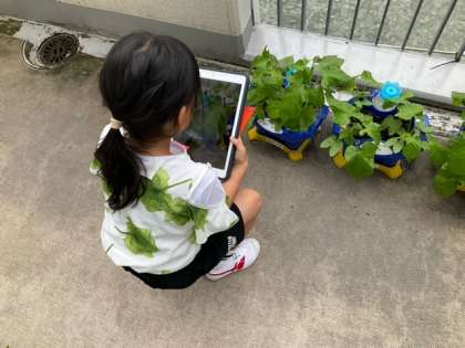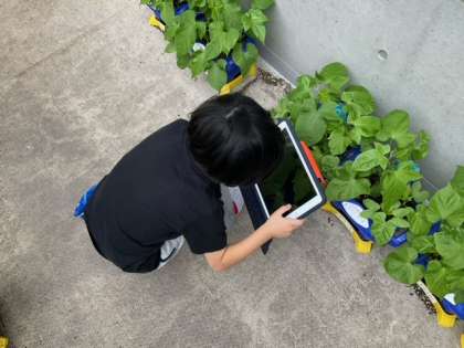 生活科の時間です。「あさがお かんさつにっき」を書いています。iPadでパチリと写真を撮って、成長の様子を記録しています。