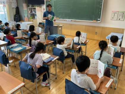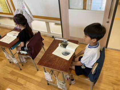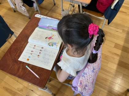 国語の時間です。「おばさんと おばあさん」違いに気をつけて読んでいます。