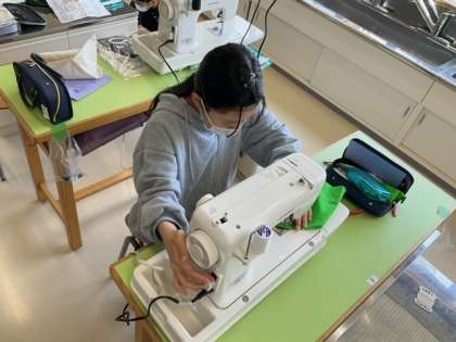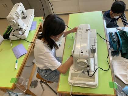 家庭科の時間です。マイバッグづくりが進んでいます。