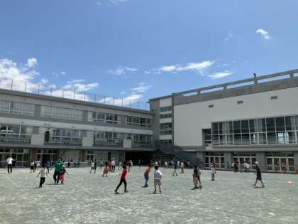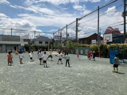 青空の下、子どもたちが元気に遊んでいます。少し雨雲が心配です。