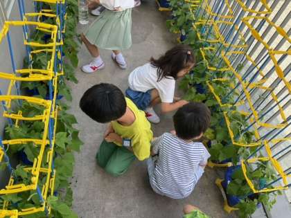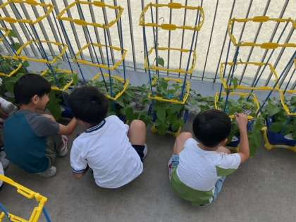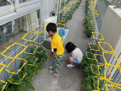 生活科の時間です。あさがおを大事に育てています。もっと大きくなるように、肥料をあげています。