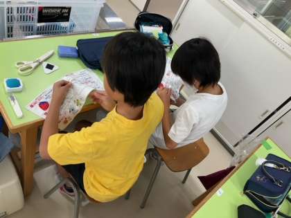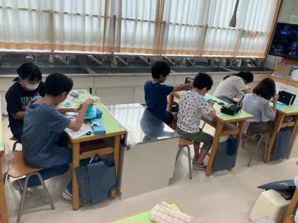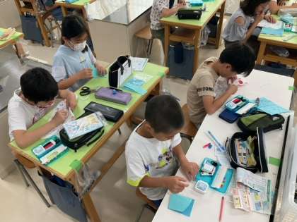 家庭科の時間です。いろいろなぬい方に挑戦しています。みんな上手だね。