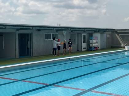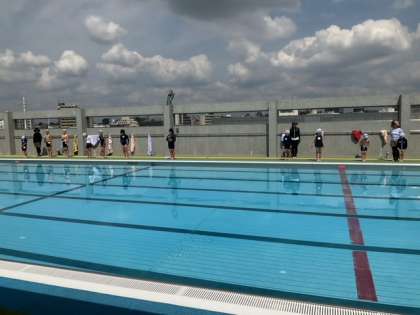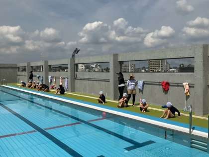 体育の時間です。プール開きをしています。代表児童のみなさんが、がんばりたいことを発表しました。